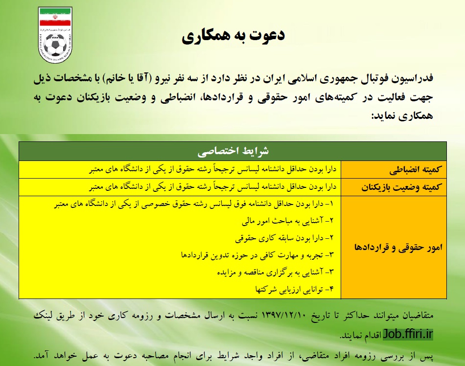 فدراسیون فوتبال جمهوری اسلامی ایران به منظور تکمیل کادر متخصص در کمیته های حقوقی و قراردادها، انضباطی و وضعیت بازیکنان نسبت به صدور اطلاعیه مربوطه اقدام کرد.